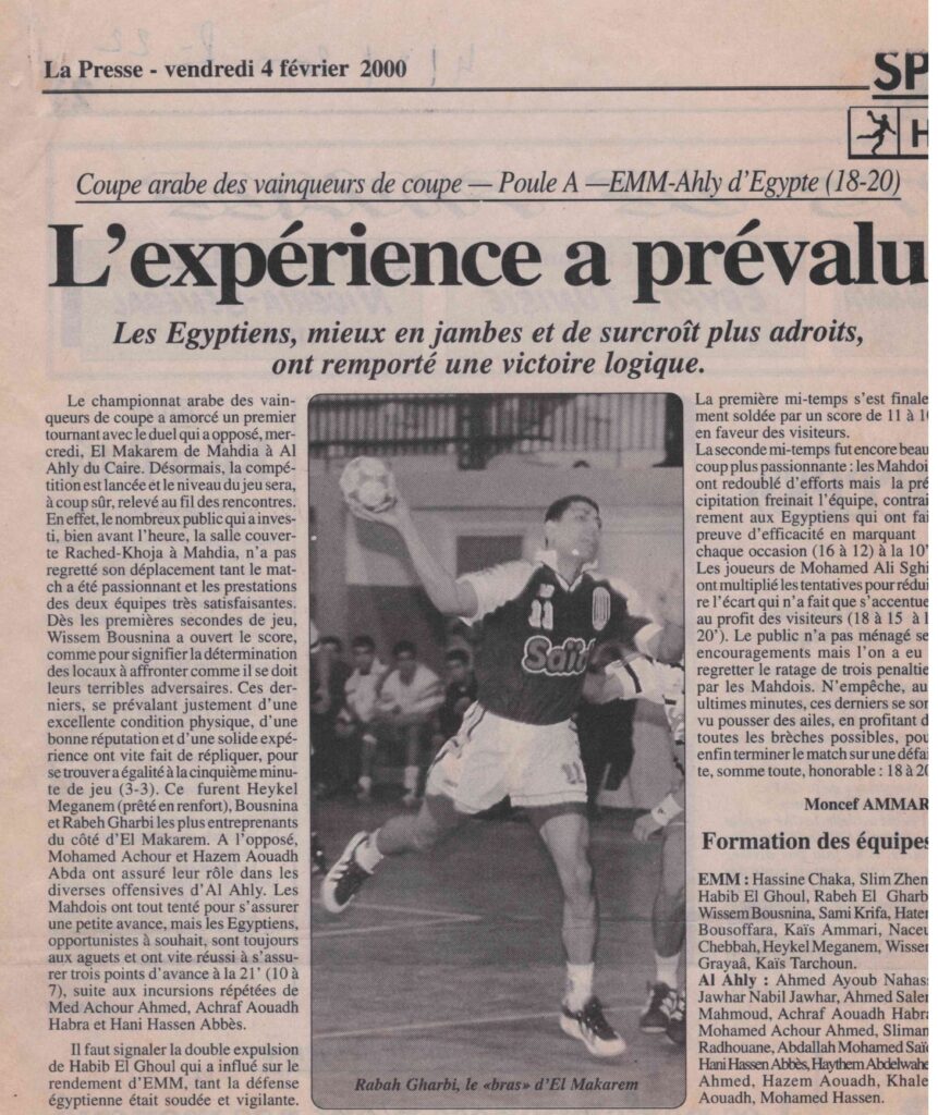 Un Stade gazonné 05-03-1987L’appel désespéré d’El Makarem 04-01-1988Echos de Mahdia 21-04-1988EMM Mahdia retrouver le bon chemin 08-08-1988Echos de Mahdia 19-12-1988Echos de Mahdia 09-01-1989M. Mahmoud Saâd Président 23-07-1991Bon départ d’El Makarem 05-10-1991Leurs impressions 07-10-1991Rien n’est perdu 07-10-1991Leurs impressions 09-10-1991L’espoir renaît à Mahdia 09-10-1991L’espoir renaît à Mahdia 09-10-1991 suiteEMM-MCA Titre en jeu 11-10-1991EMM-MCA Titre en jeu 11-10-1991 suiteIls l’ont ratée d’un cheveu 13-10-1991Zoran le magnifique 02-03-1992Zoran le magnifique 02-03-1992 suiteZoran le magnifique 02-03-1992 suiteZoran le magnifique 02-03-1992 suiteM. Ridha Joulak nouveau président 11-08-1992Cérémonie de resmise des Trophée 09-05-1994La nuit la plus longue 28-04-1999L’expérience a prévalu 04-02-2000El Makarem hors course 05-02-2000