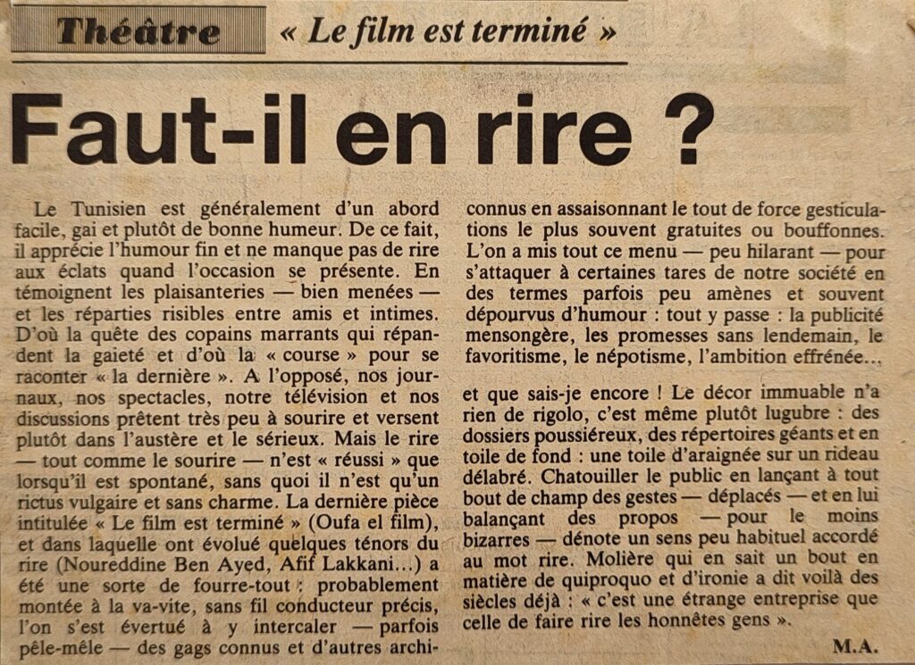 A quand la deuxième tranche du foyer universitaire 23-07-1987Festival d’été a l’heure du bilan 27-08-1987Mahdia, Allons au cinéma 10-12-1987Quand les chérubins mettent la main à la pâte 1987On prépare « En attendant Godot »Un vaudeville désopilant 30-07-1987