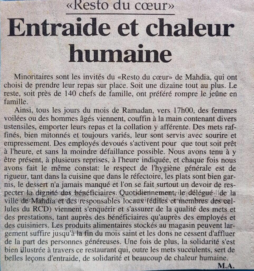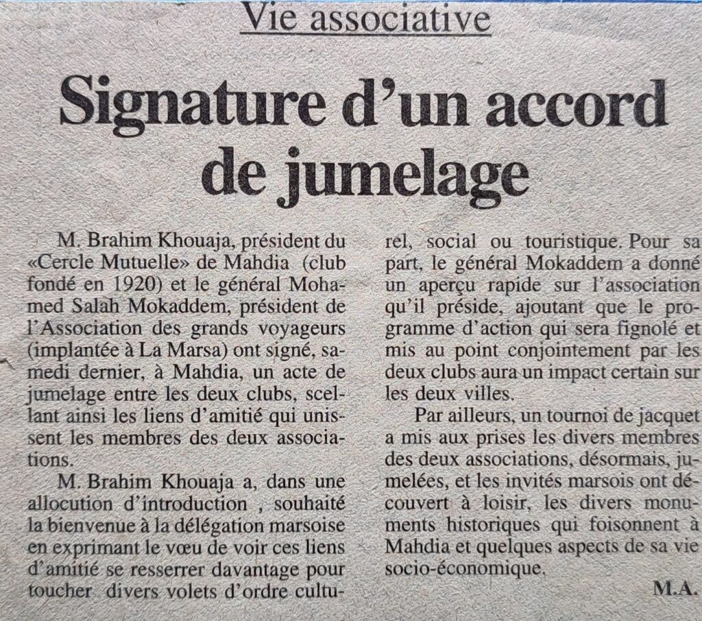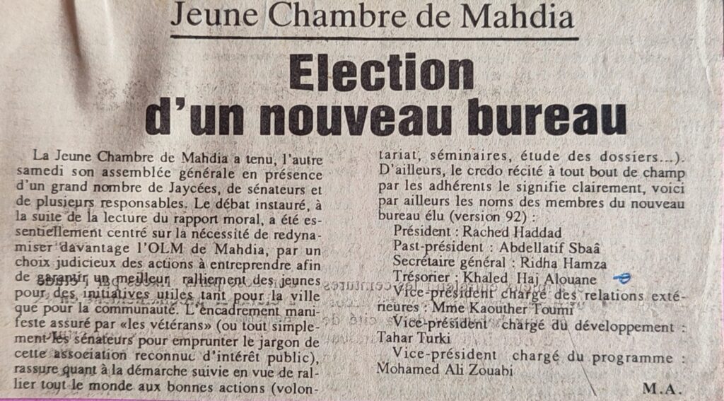Pour un rôle plus accru de la famille 26-12-2001Le bain de jouvencePrise en charge des jeunes diabétiquesNationalités diverses et actions communes25-09-2000Les Rotariens à l’œuvre 13-03-2000Table ronde 25-02-1999JCE Mahdia Un nouveau bureau élu 04-02-1998Un nouveau bureau national 23-03-1998Le cercle Mutuel sera branché sur Internet 28-08-1998Chantier de volontariat d’étudiants espagnols et tunisiens 20-08-1998Skeila ou la résurrection d’un passé révolu 22-08-1998Liftings pour cinq écoles primaires isolées 27-08-19981ere Conférence nationale des présidents des OLM 20-04-1998Consécration mondiale pour la JCE 20-11-1995Les amis du musée s’organisent 27-11-1995Mahdia futur centre international 01-11-1995Les jaycees dressent le bilan 23-01-1995Entraide et chaleur humaine 27-02-1995L’éternelle jeunesse d’une association littéraire 09-03-1995Les jeunes diabétiques se prennent en charge 20-07-1995Volontariat international pour percer un mystère archéologique 21-07-1995Grand prix de la photo sous-marine 30-08-1995Le jeunesse littéraire défie le temps 20_08-1995Les sirènes de Mahdia chantent la Méditerranée 08-09-1995Signature d’un accord de jumelage 02-10-1995Caravane de l’OTEF en faveur des élèves nécessiteux 09-10-1995l’éternelle jeunesse d’une association littéraire 09-03-1995Comité de quartier l’action d’abord 28-11-1994Les présidents des OLM en conclave à Mahdia 28-03-1994Le mécénat n’est pas mort 25-06-1994Les jeunes du monde a la découverte des vestiges de la capitale des fatimides 18-07-1994Quand les jeunes se mettent à l’œuvre 09-08-1993les scouts en congrès 22-02-1993Les secrets d’une distinction présidentielle 26-06-1992Une école nommée courage 30-05-199270eme anniversaire de la Jeunesse littéraire de Mahdia 29-04-1992OLM Élection d’un nouveau bureau 30-03-1992Priorité aux actions socio-économiques 28-02-1991Jeunesse littéraire, les secrets d’une longévité 30-09-1991Les jeunes à l’assaut des déchets sur la plage 16-07-1990L’A.G.I.M actions tous azimuts 12-04-1989OLM un programme ambitieux 09-03-1989La jeunesse littéraire toujours sur même lancée 31-08-1988Soyons à l’écoute de la voix d l’enfant 30-10-1988Jeunesse littéraire se métamorphose 22-10-1988Le planning familial à l’ordre du jour 31-12-1987N’est pas chasseur qui veut 05-03-1987
