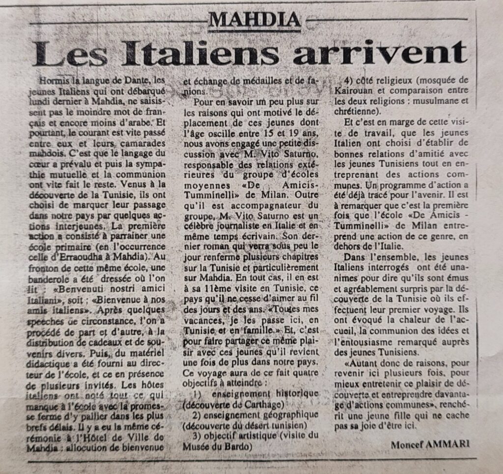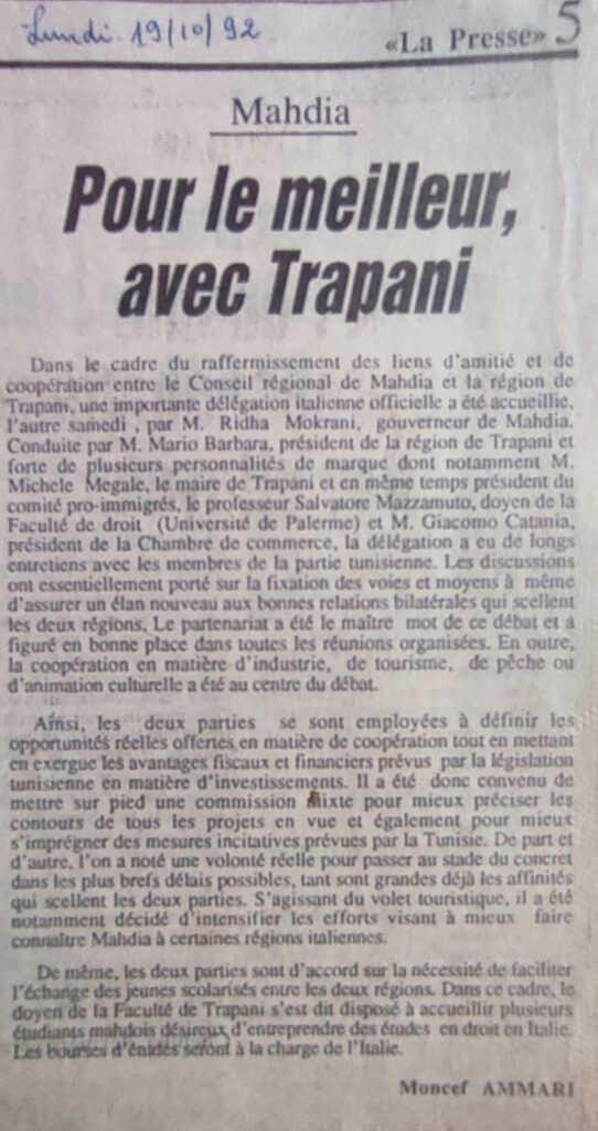 Quand les cairotes découvrent Mahdia 1992Maintenant que nous sommes sans préjugés nous devrons passer à une logique de partenariat 30-11-1992La Tunisie à tous les atouts pour réussir sur tous les plans 26-10-1992Pour le meilleur avec Trapani 19-10-1992Actes de jumelage tous azimuts 20-04-1992Relance du partenariat avec Mezzara Del Vallo 06-01-1992