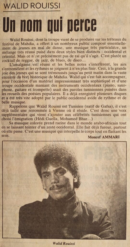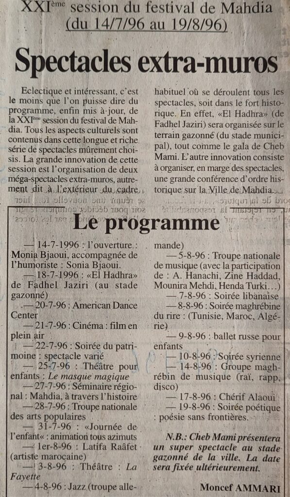 La nuit, les mauvaises langues 1997Festival de Mahdia, Le patrimoine, le rythme et la mer 1997Les ingrédients d’une belle soirée 1997Pour une dynamique nouvelle de la vie culturelle 08-12-1997