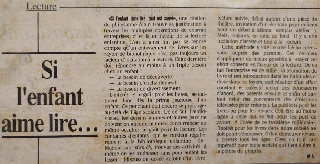 Quand les chérubins mettent la main à la pâte 1987Mahdia, Allons au cinéma 10-12-1987AIN DRAHAM Des atouts en veilleuse …27-09-1987Festival d’été a l’heure du bilan 27-08-1987Un vaudeville désopilant 30-07-1987A quand la deuxième tranche du foyer universitaire 23-07-1987Mahdia , Des plages à préserver 18-07-1987